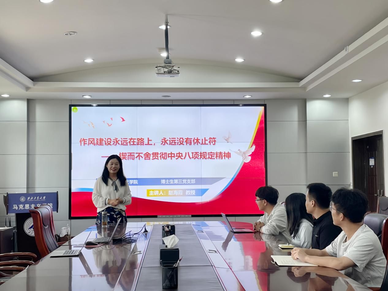 为深入学习贯彻落实中央八项规定精神,持续推进作风建设,营造风清气正的政治生态,太阳成tyc122cc博士生第三党支部于2025年5月15日上午10点,在公司208组织了一场意义深刻的专题党课。此次党课由赵海霞教授担任主讲,支部全体党员积极参与,共同学习交流。