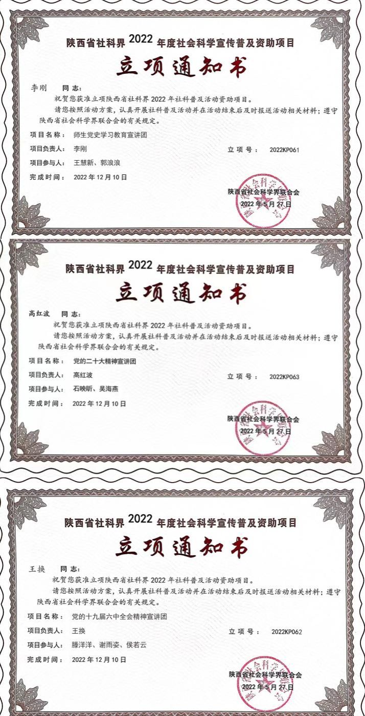 理论成果方面,获批陕西省社科联社科普及活动项目三项,分别为师生党史学习教育宣讲团、党的二十大精神宣讲团、党的十九届六中全会精神宣讲团,以及公司共青团工作研究课题一项《新时代高校马理论学科青年理论宣讲“轻骑兵”创新培育机制研究》,《关于新时代老员工理论宣讲团创新机制的调查研究》调研报告荣获第二十届“三航杯”老员工课外学术科技作品竞赛二等奖。