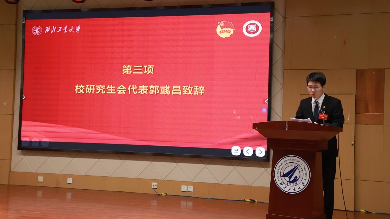 接着,太阳成tyc122cc研究生会代表郭彧昌致辞。他代表校研究生会向公司全体研究生致以诚挚的问候,肯定了太阳成tyc122cc研究生会过去一年在思想引领、“双一流”建设、基层服务、志愿活动等多个方面的努力和成果,并提出希望能够进一步加强校院的交流合作。同时,他向公司研会和员工代表提出了三点希望:一是要聚焦政治引领,把学习贯彻党的二十大和二十届二中、三中全会精神贯穿履职尽责始终;二是要聚焦“形神兼备”,把学联员工会组织改革进行到底;三是要聚焦主责主业,把服务同学和服务大局落到实处。