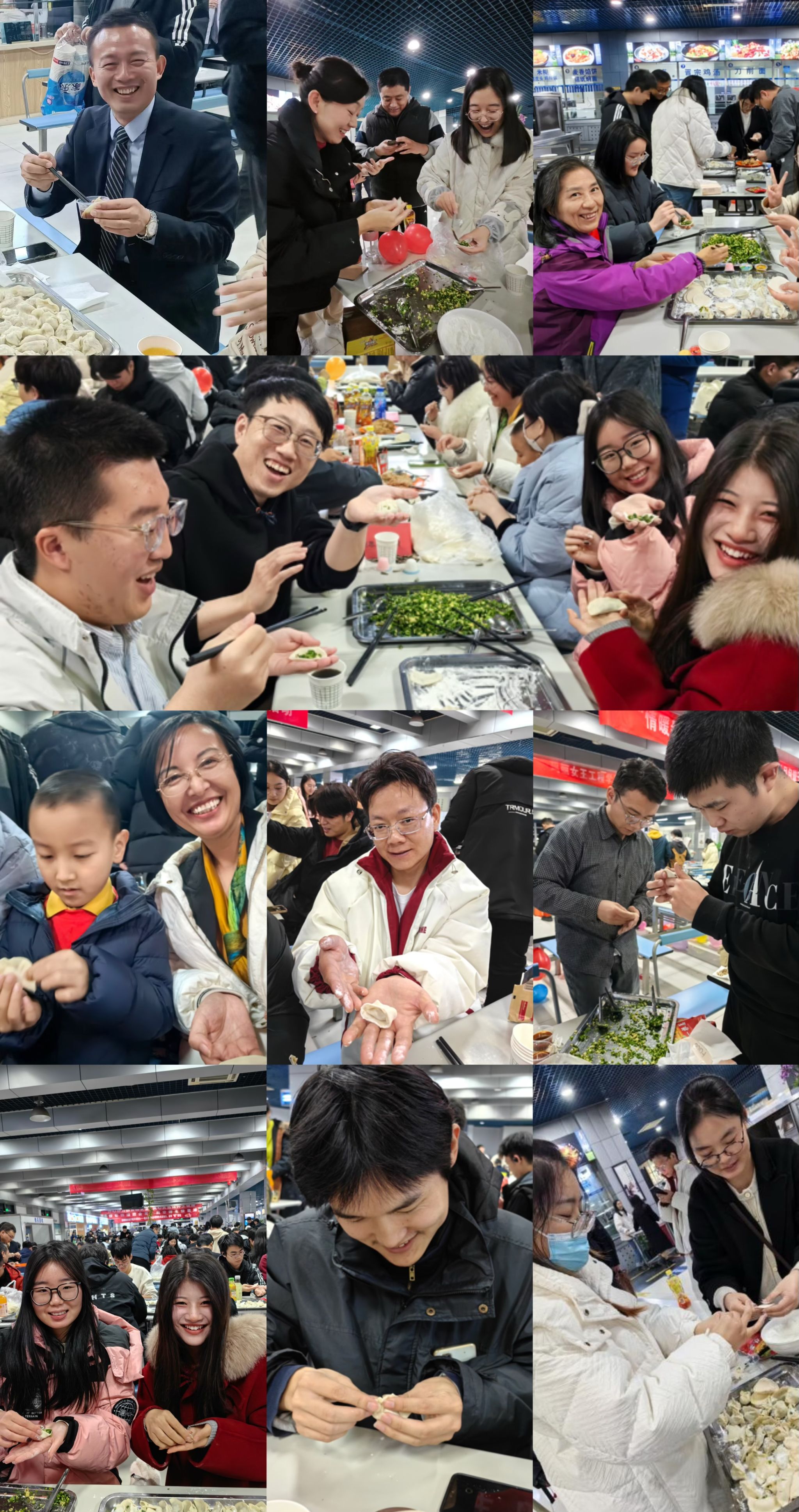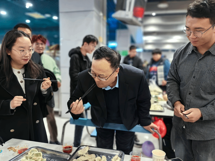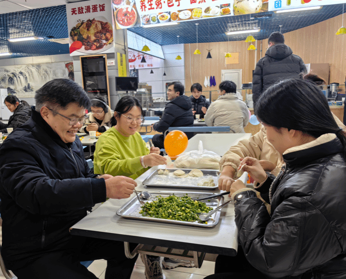 公司党委书记蒲传新老师、党委副书记李刚老师、武婉珍老师、班主任宁殿霞老师、博士生辅导员高红波老师、硕士生辅导员王换老师、班主任吕焰老师与同学们欢聚一堂,就如何包饺子、如何包好饺子展开了细致的“研究”,在交流中增进了生活本领,欢声笑语不断,师生情渐浓。