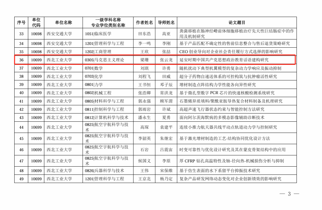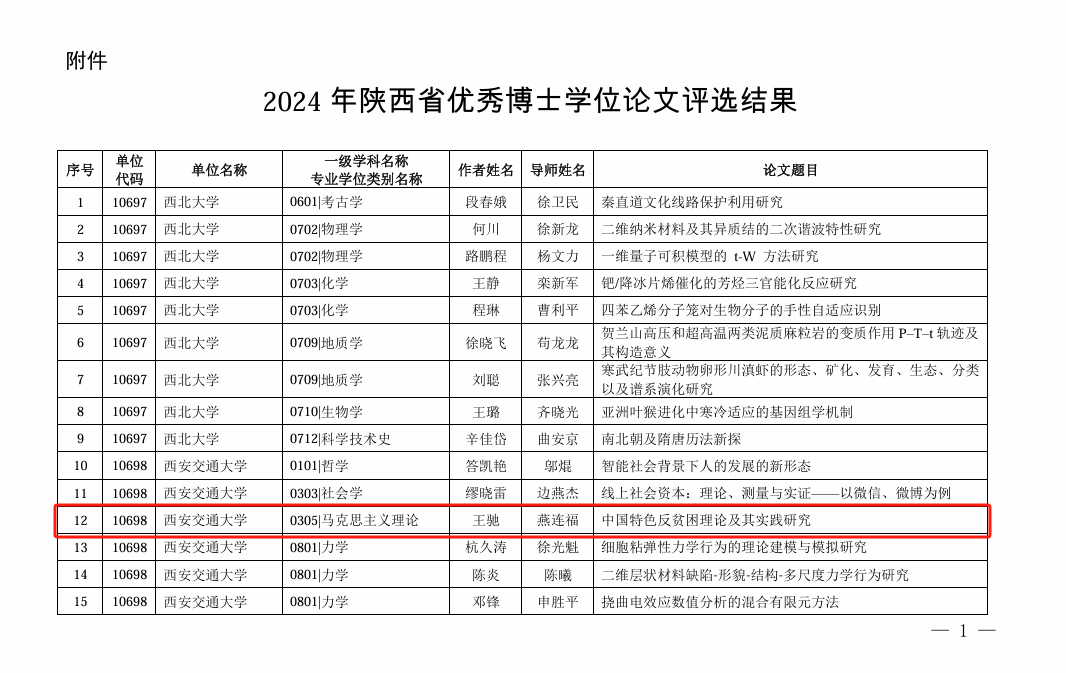 为提高博士研究生的创新能力,提升公司产品质量,陕西省组织开展了2024年省级优秀博士学位论文评选工作。11月8日陕西省教育厅、陕西省学位委员会对评选结果进行公示。太阳成tyc122cc王驰老师、梁珊同学的博士学位论文《中国特色反贫困理论及其实践研究》(指导老师:燕连福)、《延安时期中国共产党思想政治教育话语建构研究》(指导老师:张云龙)双双入选。