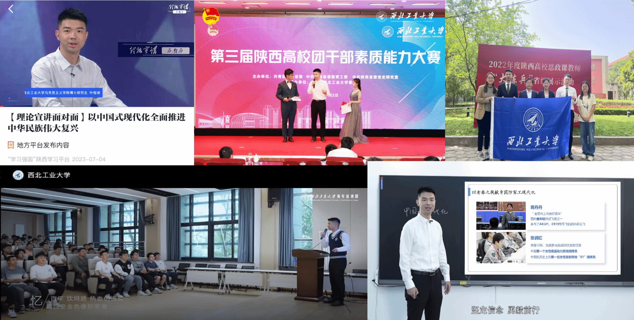 他坚持发挥马理论专业优势,主动走上大中小学课堂讲台,讲好党的创新理论成果。一方面,在“以赛促练”中提升理论宣讲过硬本领,参加多项省级教学展示、竞赛及培训,以全省第一名的成绩斩获第三届陕西高校团干部素质能力大赛一等奖,获评陕西高校思政课教师“大练兵”教学团队能手,担任校青年宣讲团讲师,为上百名在校生开展“推进中国式现代化的青年力量”主题宣讲,不断巩固壮大“总师育人文化”的主流思想舆论。另一方面,利用网络新媒体渠道拓展宣讲覆盖面,参加中共陕西省委宣传部推出的“理论宣讲面对面”栏目录制,受学习强国平台报道;在共青团陕西省委公司部指导下,参编《陕西中学团课讲义》并录制“社会主义核心价值观”主题团课;上镜录制陕西网五四青年节主题MV《青春的样子》、重庆日报《理响青年》栏目,以青年视角和大众语言传递正能量,发扬理论联系实际的优良作风和学术品格。
