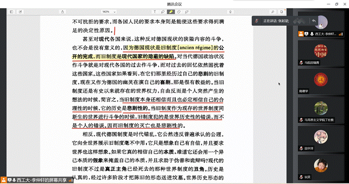 首先,张起梁老师向各位介绍了《黑格尔法哲学批判》导言的写作背景和历史背景,指出导言意义重大,标志着马克思在世界观和立场上的转变。硕士生李仲轩谈到了“而对宗教的批判是其他一切批判的前提”这一句的理解心得,认为人世间才是一切的本原,天国的现实性来自于幻想的现实性,在天国中找到的只是人类自身的反映。丁社教老师指出,在解读马恩原著时,要注重对德国历史、思想史的梳理,了解其深刻内涵和现实意义,并且硕博同学需要注重补充对原著基础性知识的把握。博士生黄奕采谈到解读文本后,可以体会到当时的德国落后的现实制度,并且提出了“牧羊人”的问题。张云龙教授为同学联系中西方文化解释说,在西方宗教里,牧羊人有其出处,指的是耶稣,后来泛指神职人员,马克思在此处主要是对当时流行的宗教救赎的批判。