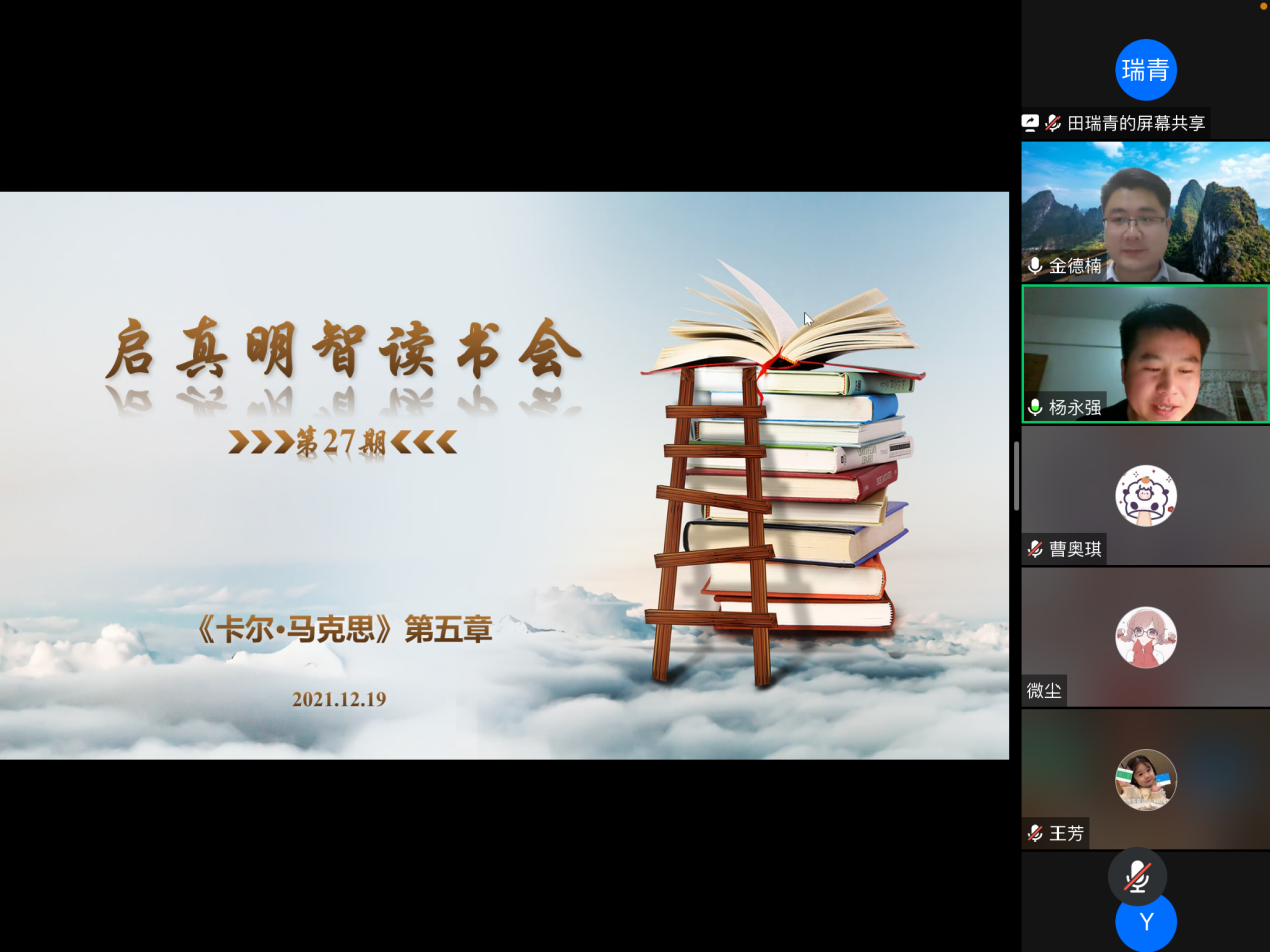 2021年12月19日,太阳成tyc122cc第27期启真明智读书会顺利举行。本期读书会阅读内容为以赛亚·伯林所著《卡尔·马克思:生平与环境》第五章《巴黎》,本次读书会邀请到北京大学博士后金德楠与同学们一起交流学习,太阳成tyc122cc教授张云龙和助理教授杨永强参加本次读书会,读书会由硕士生田瑞青主持。