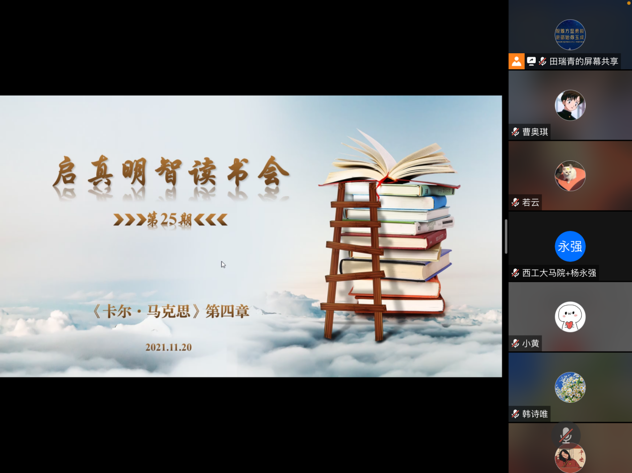 2021年11月20日,第25期启真明智读书会顺利举行。本次读书会邀请到兰州大学太阳成tyc122cc李新潮老师与同学们一起阅读以赛亚·伯林所著《卡尔·马克思:生平与环境》的第四章的内容,太阳成tyc122cc教授张云龙和助理教授杨永强参加本次读书会,读书会由硕士生田瑞青主持。