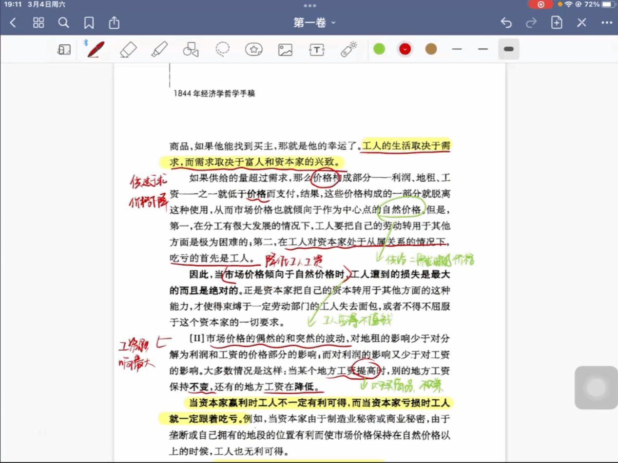 第一小组由马妍同学进行汇报,她就《手稿》的序言和工资部分进行了总结汇报,同时小组同学也提出了自己的问题:是否存在一种既保障工人利益又不影响企业经营的工资制度?张云龙老师认为首先要注意到,对于雇佣制度的批判是在近代平等观念深入人心之后才出现的,比如萨伊的“三位一体”公式,但是马克思则注意到了观念上的平等不能掩盖事实上的不平等,因此提出了剩余价值理论,揭示了资本主义社会的内在矛盾。聂阳老师同样认为在工资上做文章来改善工人的待遇是蒲鲁东的做法,马克思则与其相反,他认为工资制度是私有财产制度的具体体现,因此从本质论的角度来分析,这个问题的答案不存在的。山磊老师也认为这一调和不可能实现,因为他和蒲鲁东以及拉萨尔的论战中都是批判工资的,但是值得注意的是恩格斯晚年已经看到了工人资产阶级的出现,这一阶级在目前的资本主义国家已经发展壮大。而杨荣老师补充到,马克思认为不公平的地方在于工人和生产资料分离了,如果要在工资制度下解决这个问题的话,第一就是要工人占有相应的生产资料,那就是入股分红的形式;第二就是保护工人的利益,比如工人的专利会享有一定的收益,我们现在要想在工资前提下实现平等就要实现生产资料平等、要素平等以及分配平等,社会问题远比理论问题要难很多。