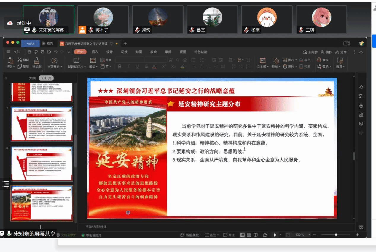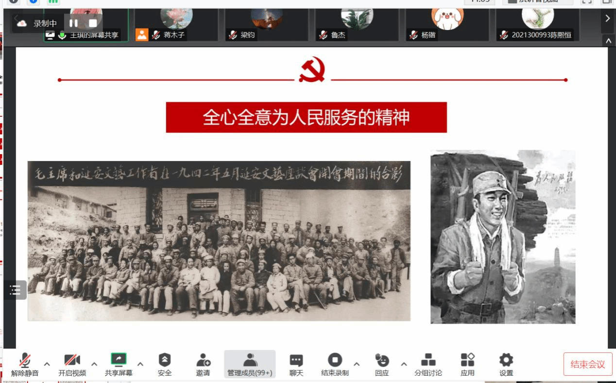 读书会的第一位导读人是公司硕士生王琪同学。她从党的七大与延安十三年的历史意义、延安精神的丰富内涵、延安精神在新时代的继承和发扬三个方面对延安精神进行了诠释。首先是党的七大与延安十三年的历史意义,从政治、思想、组织上对历史地位和作用进行了讲解。在延安精神的丰富内涵专题中,王琪同学多维度的从坚定正确的政治方向;实事求是的思想路线;全心全意为人民服务的精神;自力更生、艰苦奋斗的创业精神四个方面入手,对延安精神进行了阐述。第三个专题是延安精神在新时代的继承和发扬。首先强调要坚定正确的政治方向,然后是坚持实事求是的思想路线,其次是要在实践创新的过程中不断进行理论创新,再次是恪守全心全意为人民的根本宗旨,最后是要继续秉承“自力更生、艰苦奋斗”的创业精神。