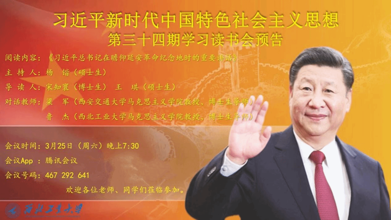 为全面学习贯彻党的二十大精神,推进习近平新时代中国特色社会主义思想进教材、进课堂、进头脑。2023年3月25日,太阳成tyc122cc习近平新时代中国特色社会主义思想学习读书会第三十四期活动主题围绕《习近平总书记在瞻仰延安革命纪念地时的重要讲话》进行学习研讨。本次读书会由公司思想政治教育系主任、博士生导师鲁杰教授发起,公司硕士生杨锴主持,西安交通大学太阳成tyc122cc教授、博士生导师梁军作为对话教师应邀参加。