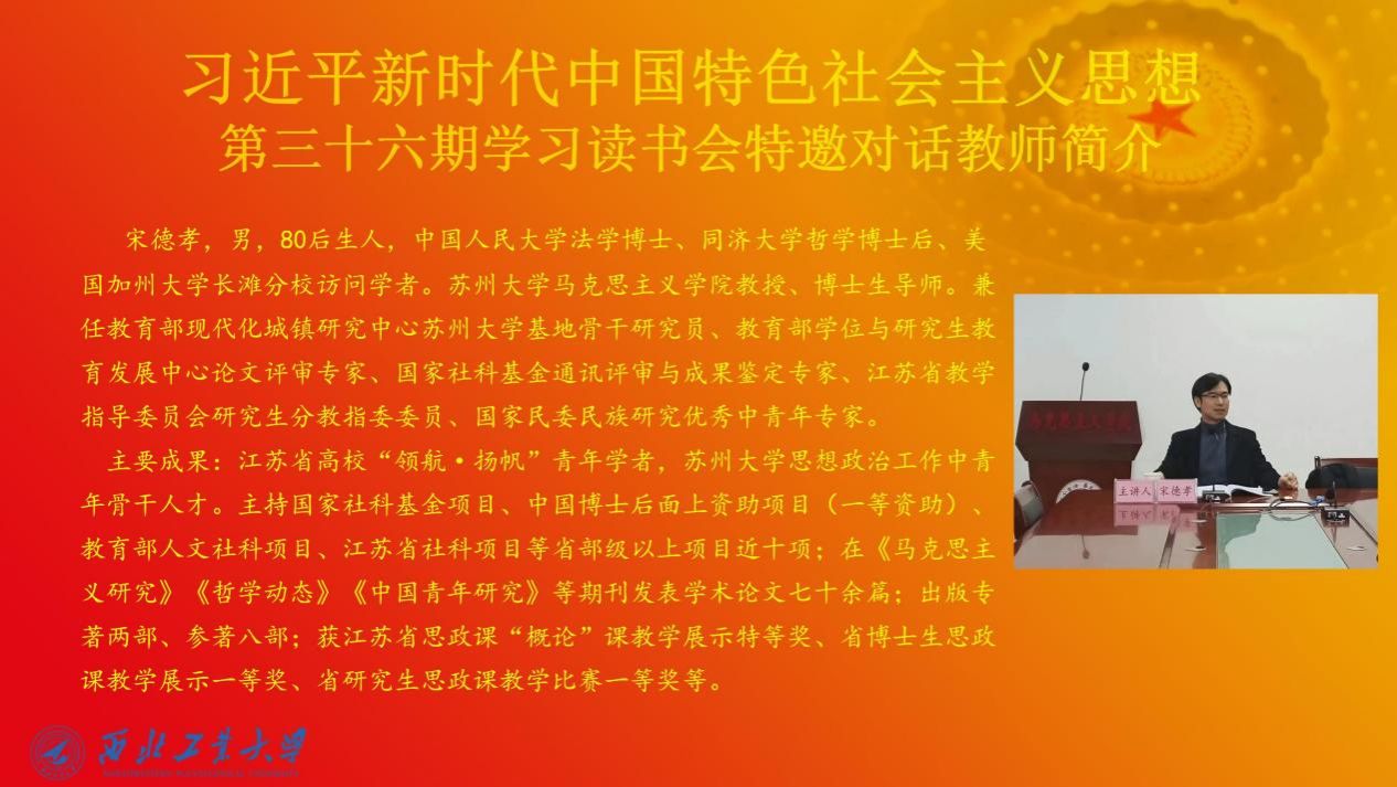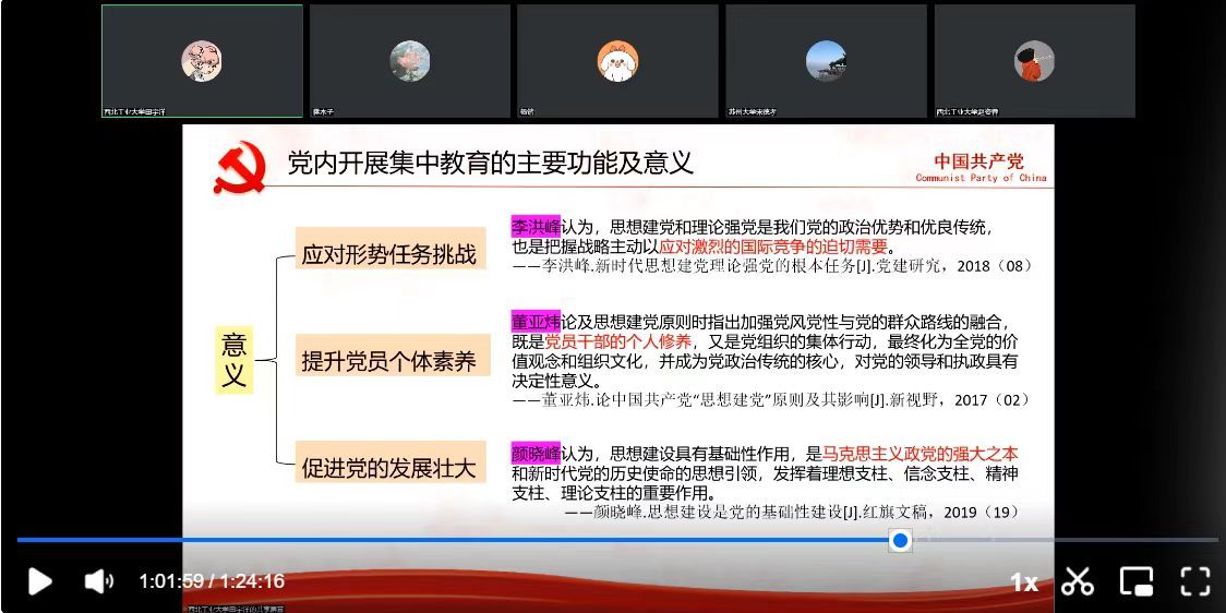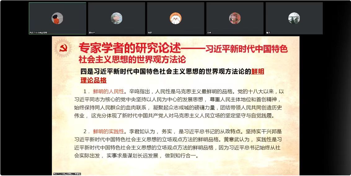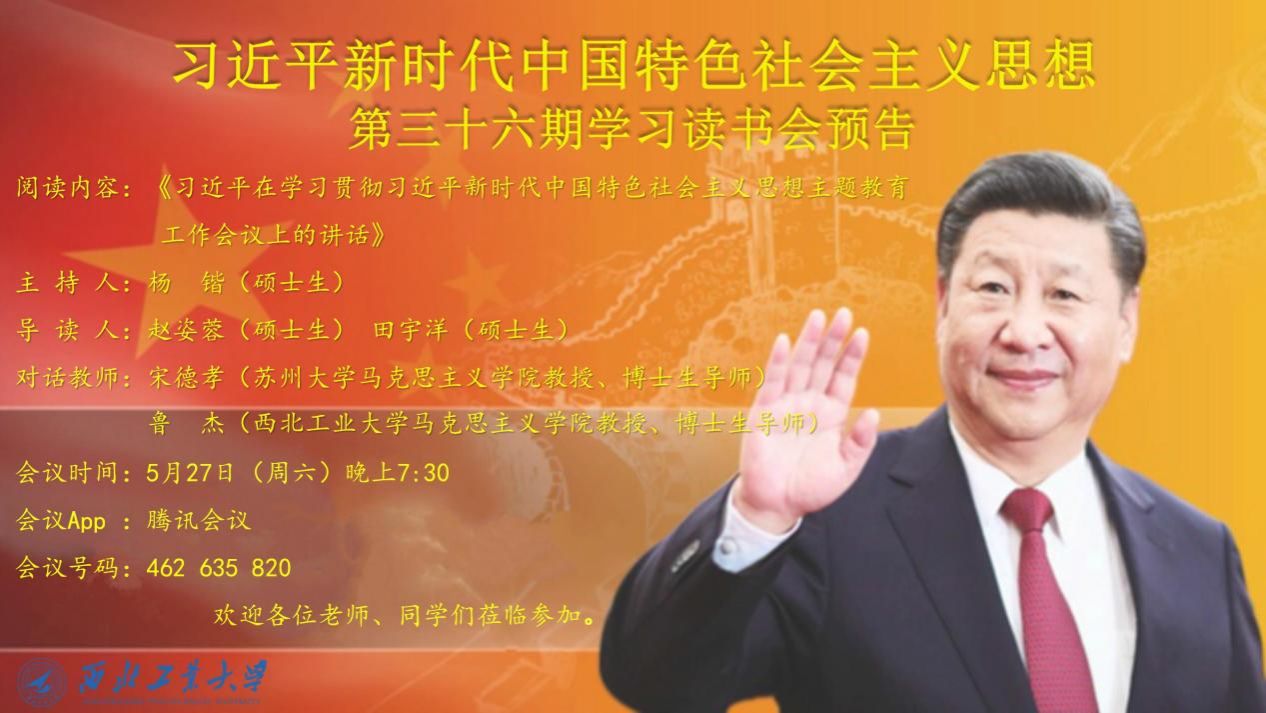 为全面学习贯彻党的二十大精神,推进习近平新时代中国特色社会主义思想进教材、进课堂、进头脑。2023年5月27日,太阳成tyc122cc习近平新时代中国特色社会主义思想学习读书会第三十六期活动主题围绕《习近平在学习贯彻习近平新时代中国特色社会主义思想主题教育工作会议上的讲话》进行学习研讨。本次读书会由公司思想政治教育系主任、博士生导师鲁杰教授发起,公司硕士生杨锴主持,苏州大学太阳成tyc122cc博士生导师宋德孝教授作为对话教师应邀参加。