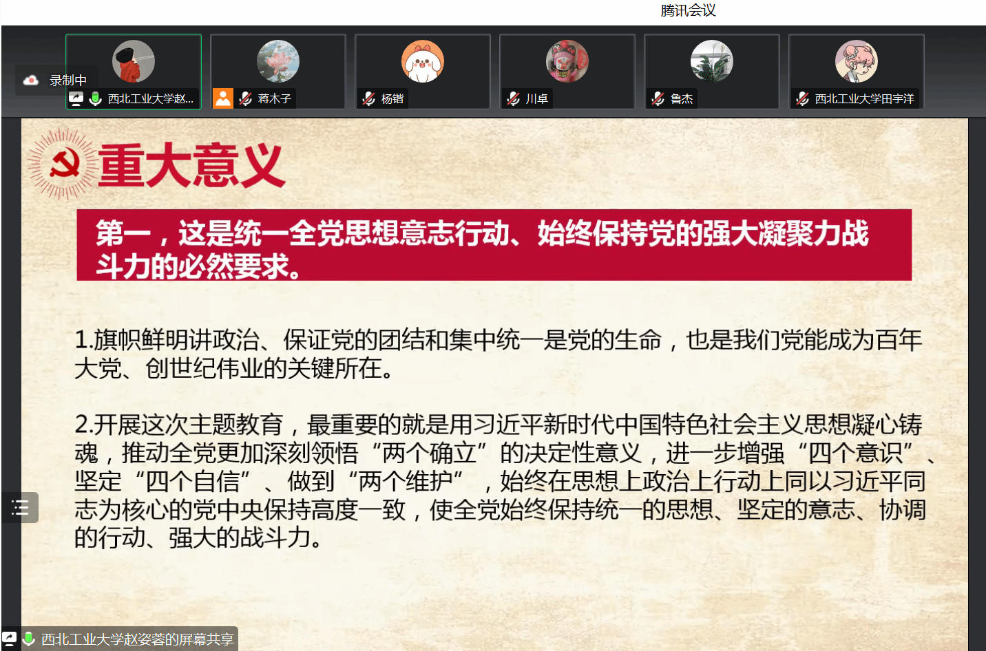 接下来,由公司硕士生田宇洋同学进行导读。她首先通过总结专家学者的论述,介绍了习近平新时代中国特色社会主义思想的历史起点和逻辑起点,并阐述了国内国外的意义。第一部分是对这次讲话的重要意义进行解读,通过结合党的二十大报告,指出了这次讲话是统一全党思想意志行动、始终保持党的强大凝聚力、战斗力;是推动全党积极担当作为、不断开创事业发展新局面;是深入推进全面从严治党、以党的自我革命引领社会革命的必然要求。第二部分是全面准确把握主题教育的目标要求进行了自己的阐释。第三部分从明确领导责任;强化督促指导;注重统筹兼顾;加强宣传引导四个部分来论述如何切实加强对主题教育的领导。最后一部分对学习贯彻习近平新时代中国特色社会主义思想的目的进行总结,即对全党而言要提高运用党的创新理论的能力,对领导干部而言要坚持以身作则、以上率下。