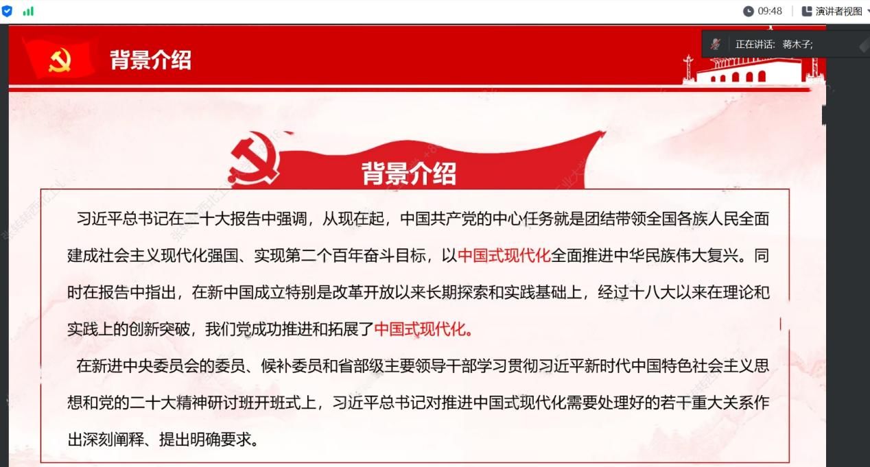 读书会的第一位导读人是公司硕士研究生蒋木子同学。她将导读内容分为四部分进行阐释。第一部分是讲述了导读文本的背景内容,习近平总书记在党的二十大报告中强调,从现在起,中国共产党的中心任务就是团结带领全国各族人民全面建成社会主义现代化强国、实现第二个百年奋斗目标,以中国式现代化全面推进中华民族伟大复兴。第二部分是对文本内容关于顶层设计与实践探索的关系、战略与策略的关系、守正与创新的关系、效率与公平的关系、活力与秩序的关系、自立自强与对外开放的关系进行了全方位多维度的解释。第三部分从中国式现代化的理论逻辑、历史逻辑和时间逻辑对文本内容进行了拓展解读。第四部分重点介绍了中国式现代化的由来以及相关研究。