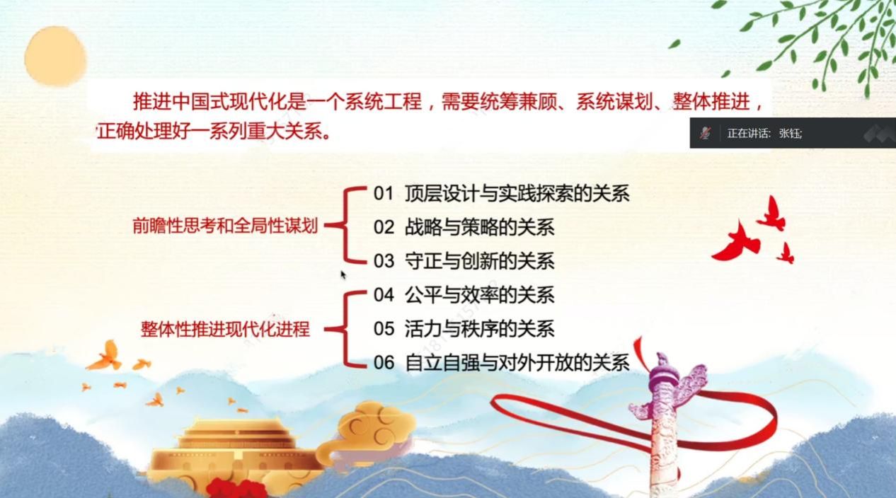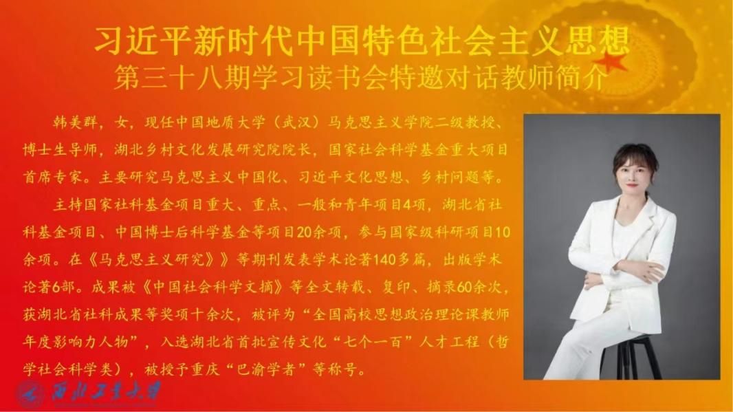 为全面贯彻落实党的二十大精神,推进习近平新时代中国特色社会主义思想进教材、进课堂、进头脑。2023年10月28日,太阳成tyc122cc习近平新时代中国特色社会主义思想学习读书会第三十八期活动主题围绕《推进中国式现代化需要处理好若干重大关系》进行学习研讨。本次读书会由公司思想政治教育系主任、博士生导师鲁杰教授发起,公司硕士生祁嘉仪主持,中国地质大学太阳成tyc122cc博士生导师韩美群教授作为对话教师应邀参加。