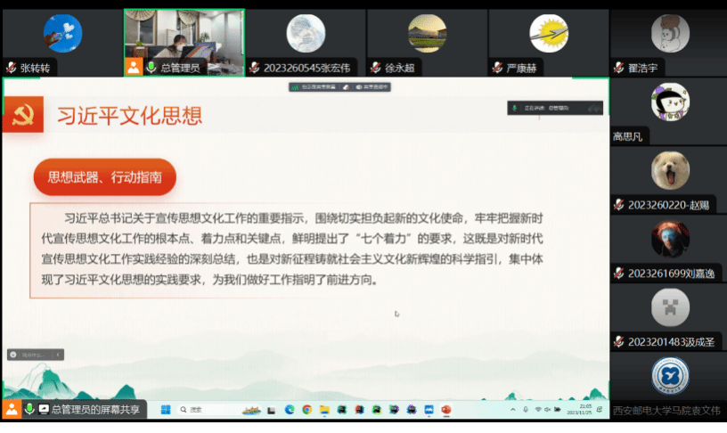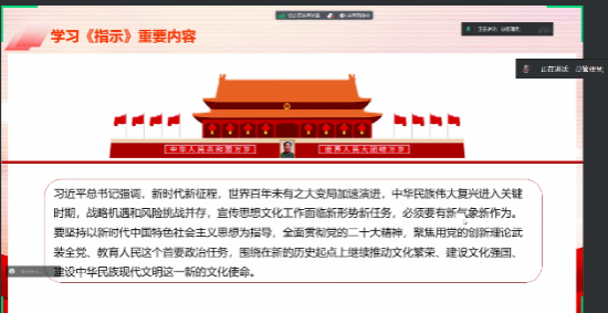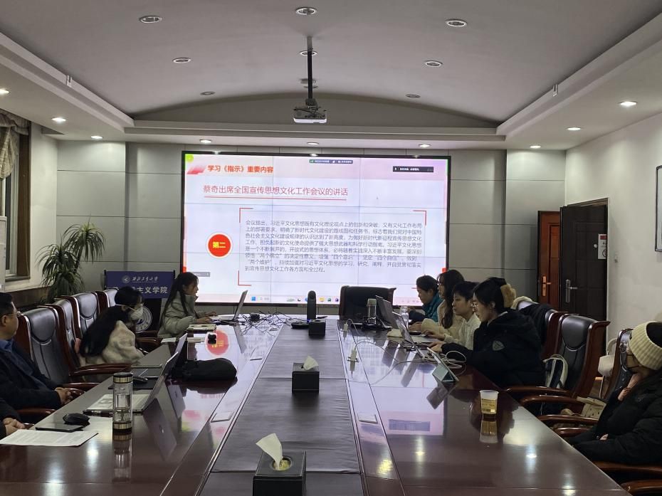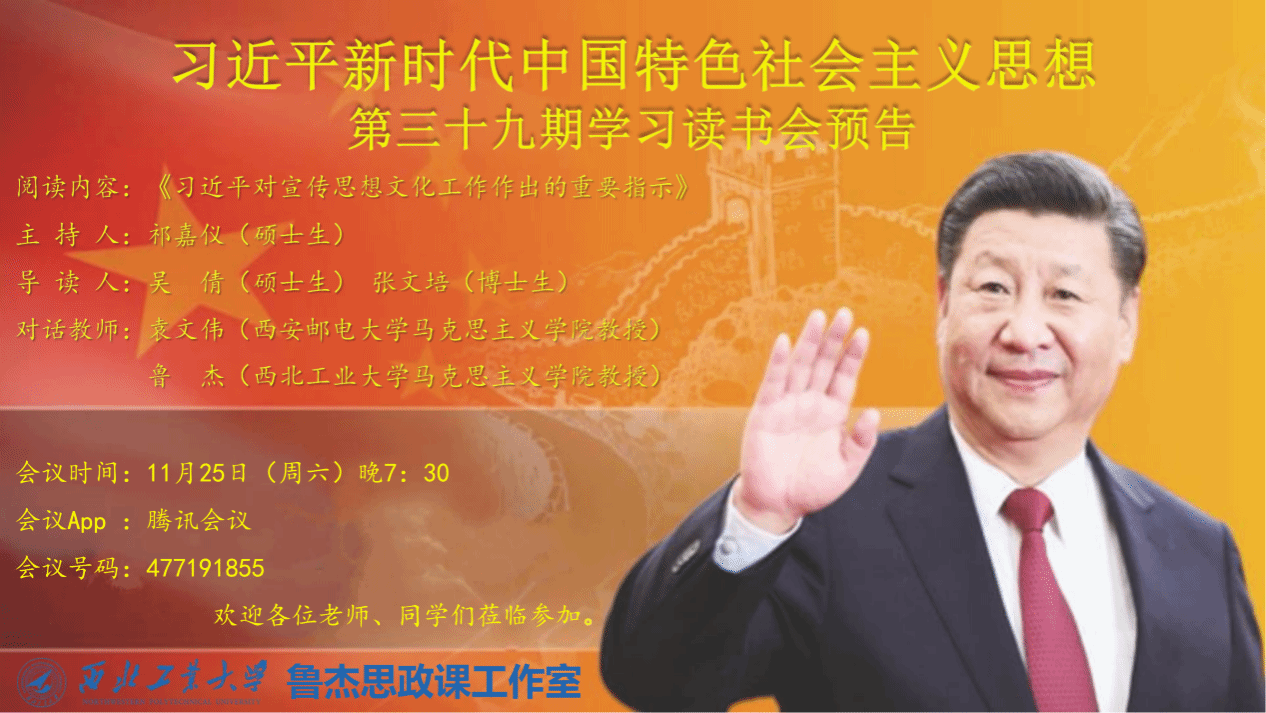 为全面学习贯彻党的二十大精神,推进习近平新时代中国特色社会主义思想进教材、进课堂、进头脑。2023年11月25日,太阳成tyc122cc习近平新时代中国特色社会主义思想学习读书会第三十九期活动主题围绕《习近平对宣传思想文化工作作出的重要指示》进行学习研讨。本次读书会由公司思想政治教育系主任、博士生导师鲁杰教授发起,公司硕士生祁嘉仪主持,西安邮电大学太阳成tyc122cc袁文伟教授作为对话教师应邀参加。本期读书会创新活动举办形式,首次采取线上线下相结合的方式,设置线下分会场,邀请导读同学、对话教师、硕士博士研究生在公司楼208会议室交流学习。