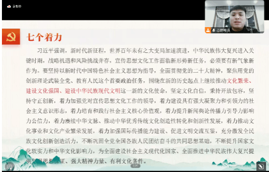 接下来,由公司博士生赵欣同学进行导读。他将导读内容分为三部分进行讲解。首先,他介绍了《习近平对宣传思想文化工作作出的重要指示》的重要内容与会议重要成果,着重解读“七个着力”与党的二十大关于文化建设的战略部署、“中华民族现代文明”相关的内容,并结合习近平文化思想的内涵,阐述了习近平文化思想是一个不断展开的、开放式的思想体系,必将随着实践深入不断丰富发展。其次,介绍了专家学者对习近平文化思想的解读和阐释。在当前关于“习近平文化思想”的已有研究中,他选取了其中具有代表性的文章进行分享。张云飞、李娜在《论习近平文化思想的科学体系》一文中,以新时代关于文化建设的“文本群”为文献依据,将习近平文化思想的主要内容概括为十个命题;张士海认为习近平文化思想内涵丰富、逻辑严谨、自成体系,对其鲜明特点做了分析;辛向阳和吕耀龙从战略、历史、系统、辩证、创新、法治和底线思维领会习近平文化思想的理论智慧和哲学奥秘;徐国亮和薛伟在习近平文化思想视域下,提出中华优秀传统文化国际传播的价值、内容、条件、实践的四重维度。最后,他提出关于“两个结合”与文化主体性的新思考。一是“两个结合”巩固了文化主体性,创立习近平新时代中国特色社会主义思想就是这一文化主体性的最有力体现。二是中华民族文化主体性的短暂动摇与迷失错落。三是中国文化主体性的迷失就其因由而言随着西方文化的不断渗透,西方现代性理论与中国民族传统文化的冲突导致对民族文化的质疑与否定。四是中国共产党重塑中华文化主体性。五是“第二个结合”巩固文化主体性的理与路,“第二个结合”回答了当代中国马克思主义如何展现世界意义的问题,是在世界舞台上展现文化自我主张的必由之路。