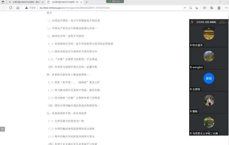 思想政治教育系于8月15日晚,在线召开集体备课会。各位老师结合会前对周末理论大讲堂等专家报告的自主学习、《台湾问题与新时代中国统一事业》白皮书的认真学习,通过轮流发言、相互交流、共同探讨的方式,对全体教师暑期备课进度及理论学习情况进行了交流与探讨。经理杨云霞、系主任鲁杰及承担思想政治教育课教学工作的全体教师参加了此次备课会。学习过程中,老师们普遍认为,白皮书的发表振奋人心,及时、充分地体现了中央对解决台湾问题、推进实现祖国统一事业的信心和决心,同时也体现了中央愿意以最大诚意、尽最大努力争取和平统一的意志。国家的统一是我们中华民族走向伟大复兴的历史必然,台湾是中国的一部分,同时祖国完全统一的进程也不可阻挡。作为一名思政课教师,我们要引导员工学习和掌握台湾问题的历史,树立实现国家统一的历史使命感和责任感,激发员工为祖国统一和实现中华民族伟大复兴而奋斗的信心和动力。
