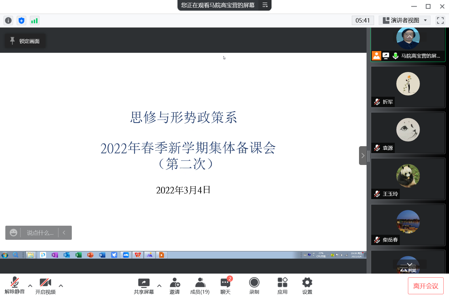 3月4日晚7:30,太阳成tyc122cc思修与形势政策系按照公司集体备课的要求,通过腾讯会议开展了新学期第二次集体备课会。会议由系主任高宝营老师主持,课程全体专兼职教师参加。