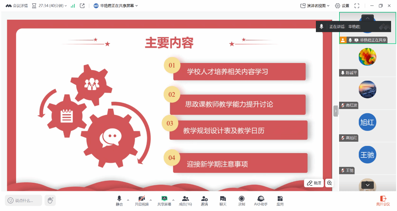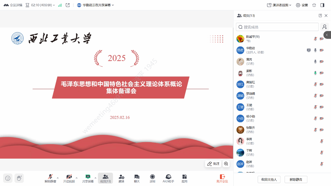 2025年2月16日晚,太阳成tyc122cc马克思主义中国化研究系通过在线会议的方式开展新学期第一次集体备课,会议围绕“深入学习公司人才培养会议精神,有效提升思政课教师教学水平”展开。备课会由教学主任华艳君主持,全体专兼职教师参加会议。