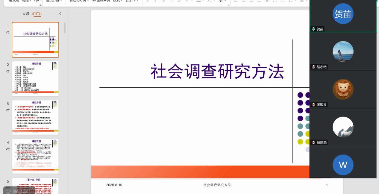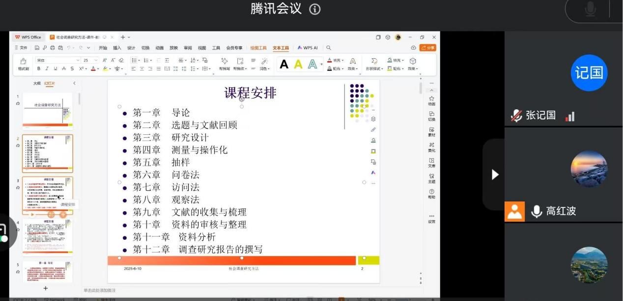 高红波根据公司前期相关安排部署情况,简要说明了思政实践课关于社会调查研究方法教学的重要性,并结合思政实践课理论教学要求,提出社会调查研究方法课程的教学内容设计与具体课时安排。同时说明了通过各方共同努力,综合参考多种社会研究方法教材和著作,调研总结部分高校社会研究方法课程经验,课程组顺利完成思政实践课社会调查研究方法课件主体内容设计。高红波详细介绍了全篇各个章节的基本情况和部分章节的重点教学内容与注意事项,并提出为了进一步完善课件内容,课程组全体老师可点对点地提出有针对性的修改意见和建议。