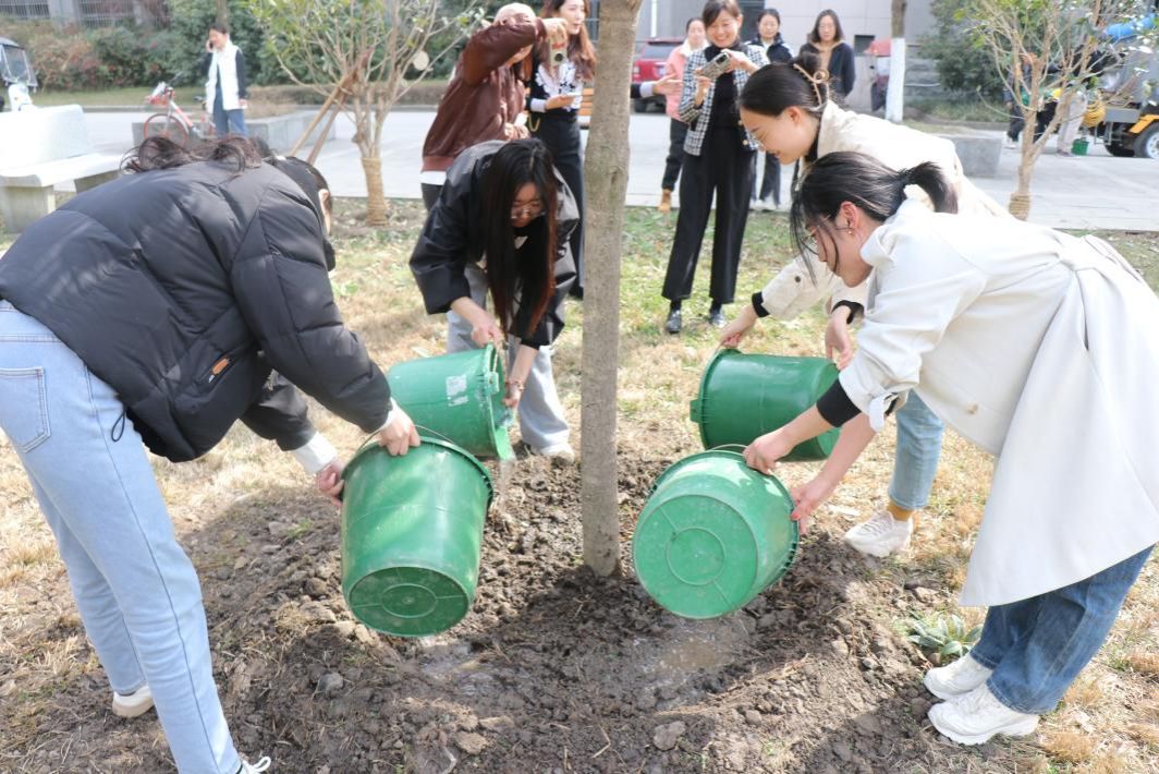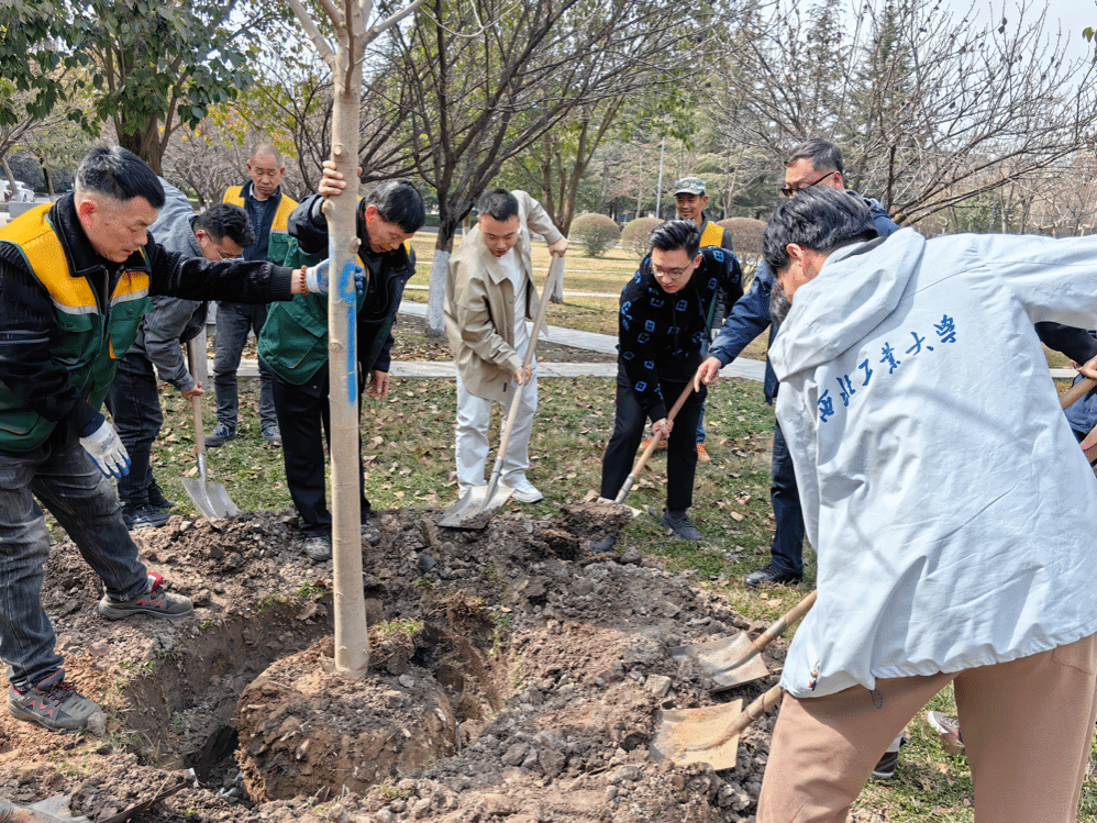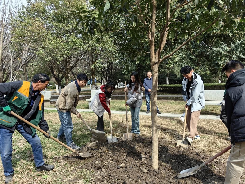 恰值三月春风柔,播撒希望趁佳期。阳光洒落,绿意满园,师生们手持铁锹,分工合作,齐心协力,干劲十足。挖坑、扶苗、培土、浇水,在后勤产业集团物业服务中心专业人员的指导下,每一个动作都充满力量,每一道目光都凝聚希望。最后,在师生的共同努力下,桂花树和玉兰树新苗挺立,生机勃勃。现场欢声笑语,气氛热烈而融洽,大家共同庆祝这充满希望的植树佳期,期待绿意更浓的未来。