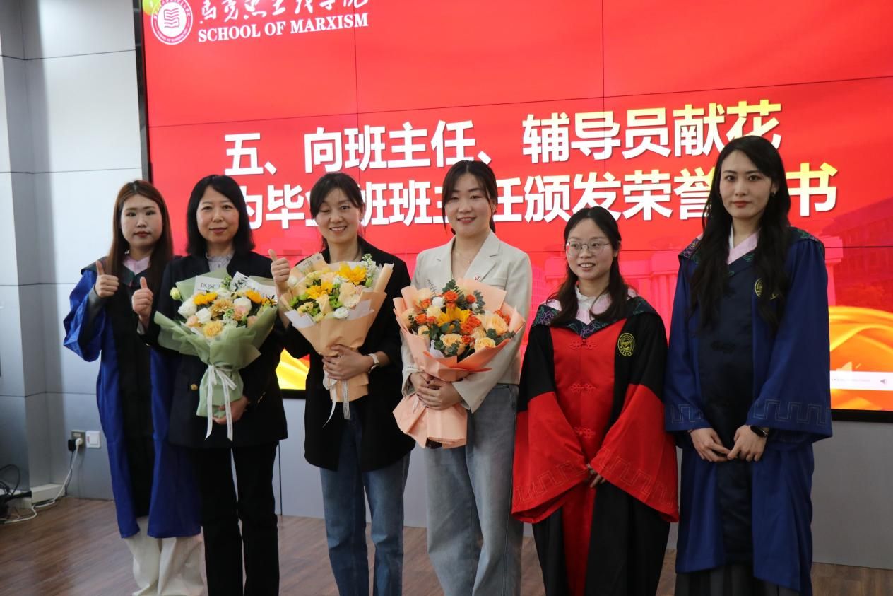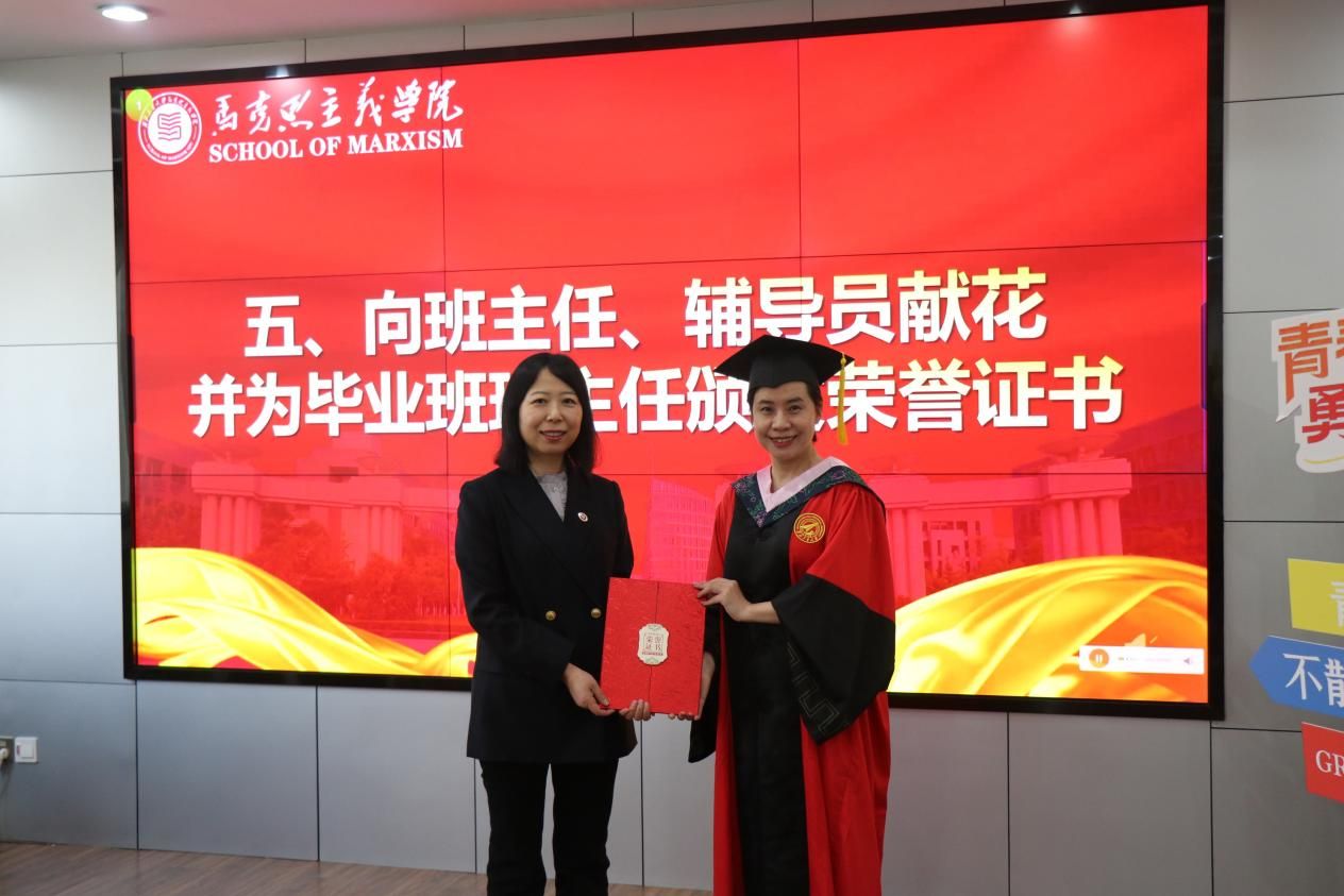 毕业生代表为硕士生辅导员王换、博士生辅导员许斯诺、毕业生班主任代表薛金慧献花,公司副经理贺苗为薛金慧颁发荣誉证书,以感谢老师们近年来的辛勤付出和无私奉献。随后,薛金慧发表了感人至深的发言,向顺利完成学业的同学们表示祝贺,并以“热情、责任、勇敢”寄语毕业生们在新的人生道路上充满激情、肩负使命、无畏前行。