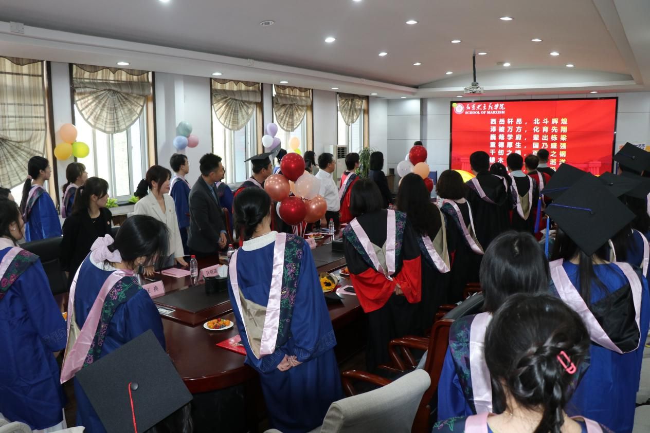 典礼的最后,在庄严而神圣的氛围中,杨云霞经理和张云龙副经理为毕业生逐一拨穗正冠,颁发学位,并合影留念。