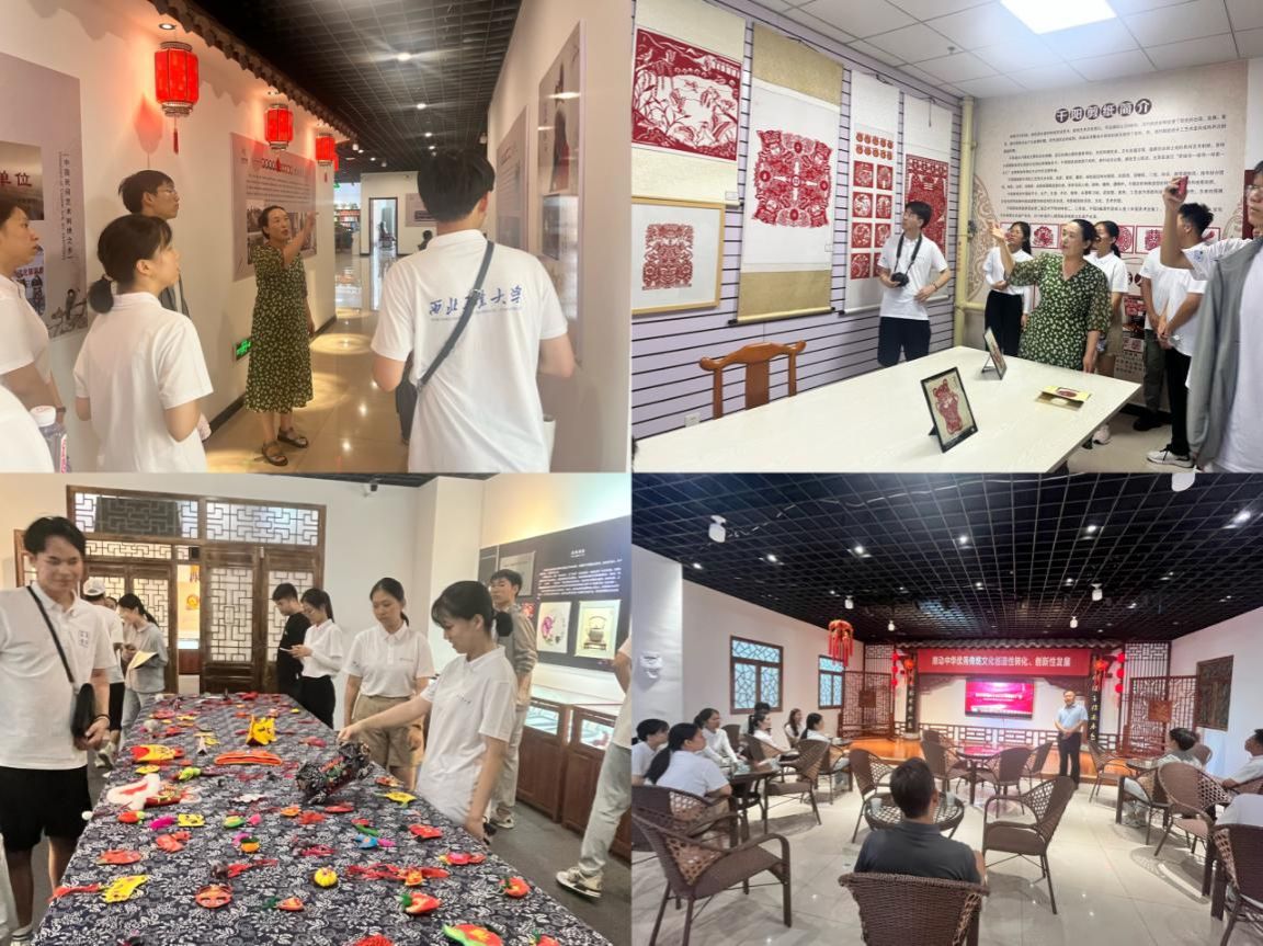 接着,王海燕带领队员们参观了精美的刺绣作品——绣花鞋垫、云肩、蛙枕等婚俗刺绣,肚兜、马甲、帽圈等刺绣以及精变图、八卦镜、镇宅狮等刺绣。近年来,在当地政府的大力支持和推动下,千阳刺绣坚持创新性转化,创造性发展,还设有直播间、专业培训班等。担任千阳县金达莱刺绣专业合作社法人代表的王海燕还指出千阳刺绣助力乡村振兴,目前千阳县已建成8个西秦刺绣传习所,21个刺绣专业合作社,带动数万名妇女就业,提升群众产业参与度。除刺绣以外,千阳剪纸也保留了较多原生态的文化特征,剪纸创作围绕节令、生产、生活等等习俗,在造型、工艺、着色上颇具地方特色,兼具文化与艺术价值。
