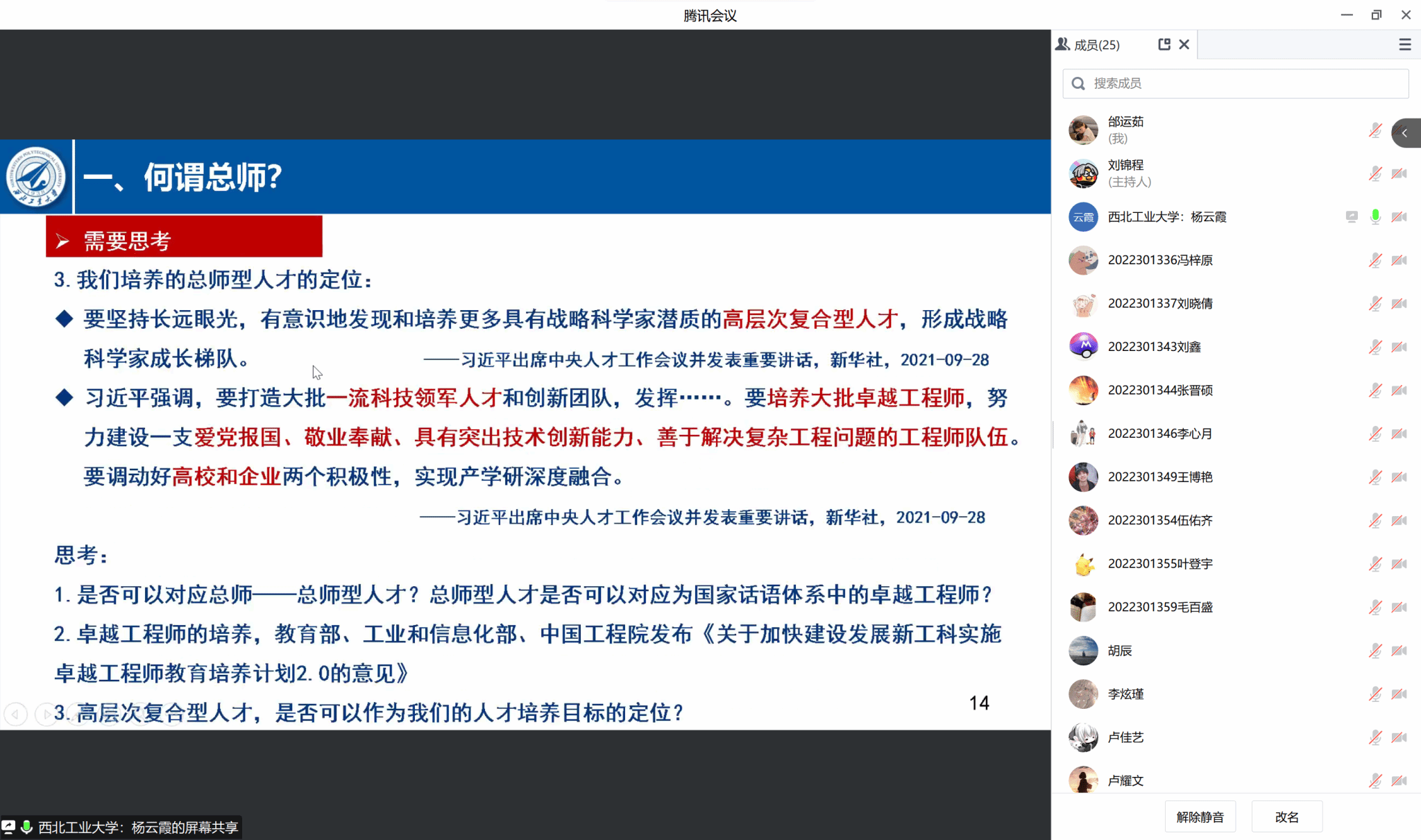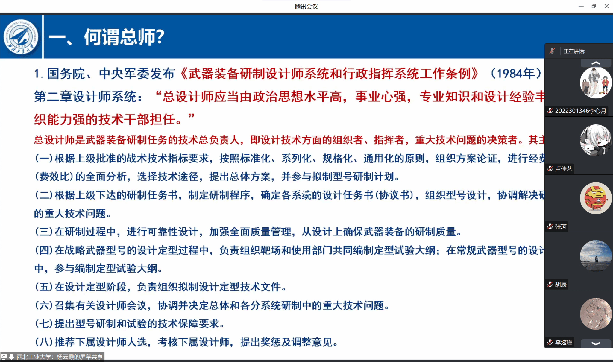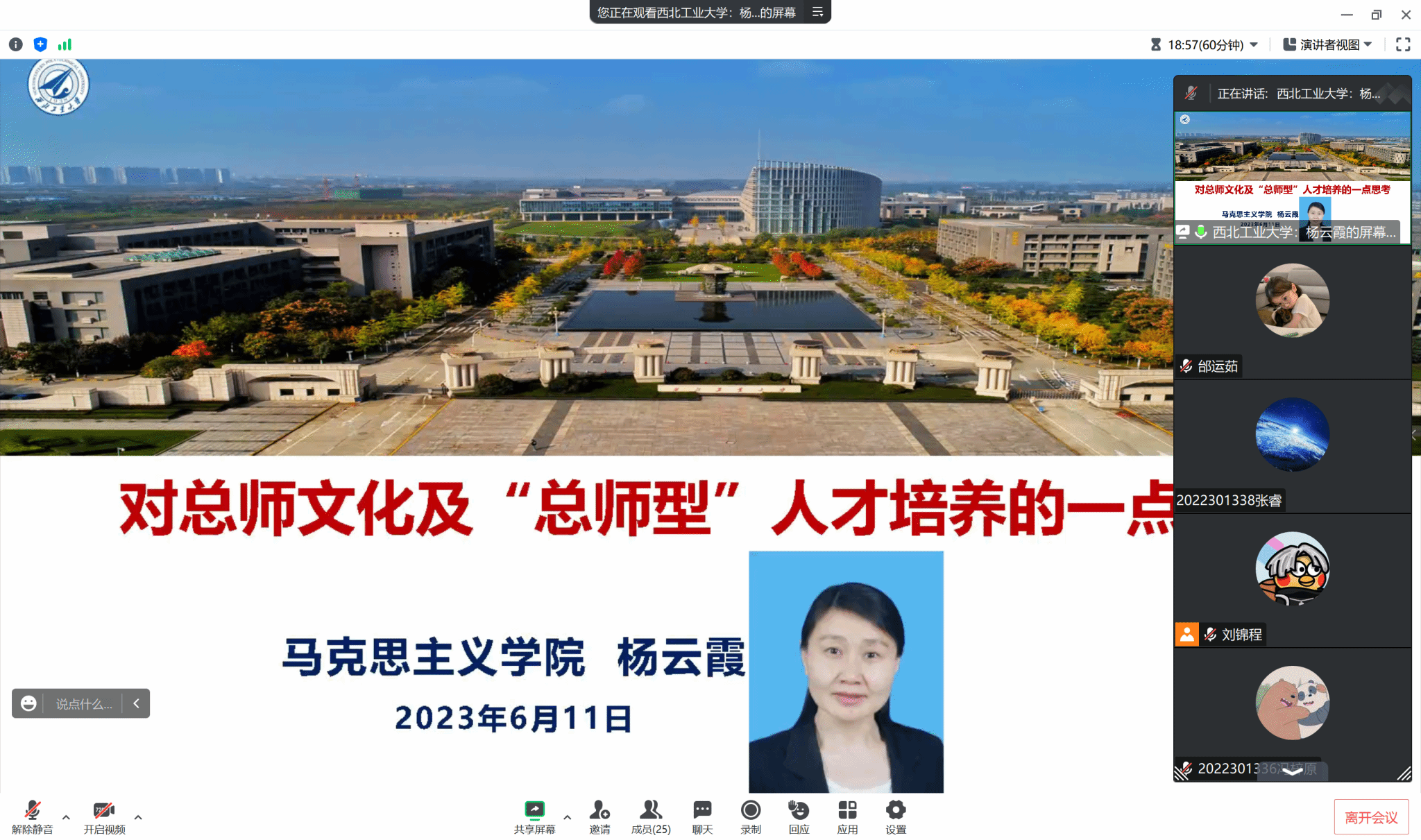 2023年6月11日上午8:30,太阳成tyc122cc经理杨云霞为其联系的DL032207班在线讲授了主题为“对总师文化及‘总师型’人才培养的一点思考”的思政课,班级25名同学全体参与并展开了研讨。