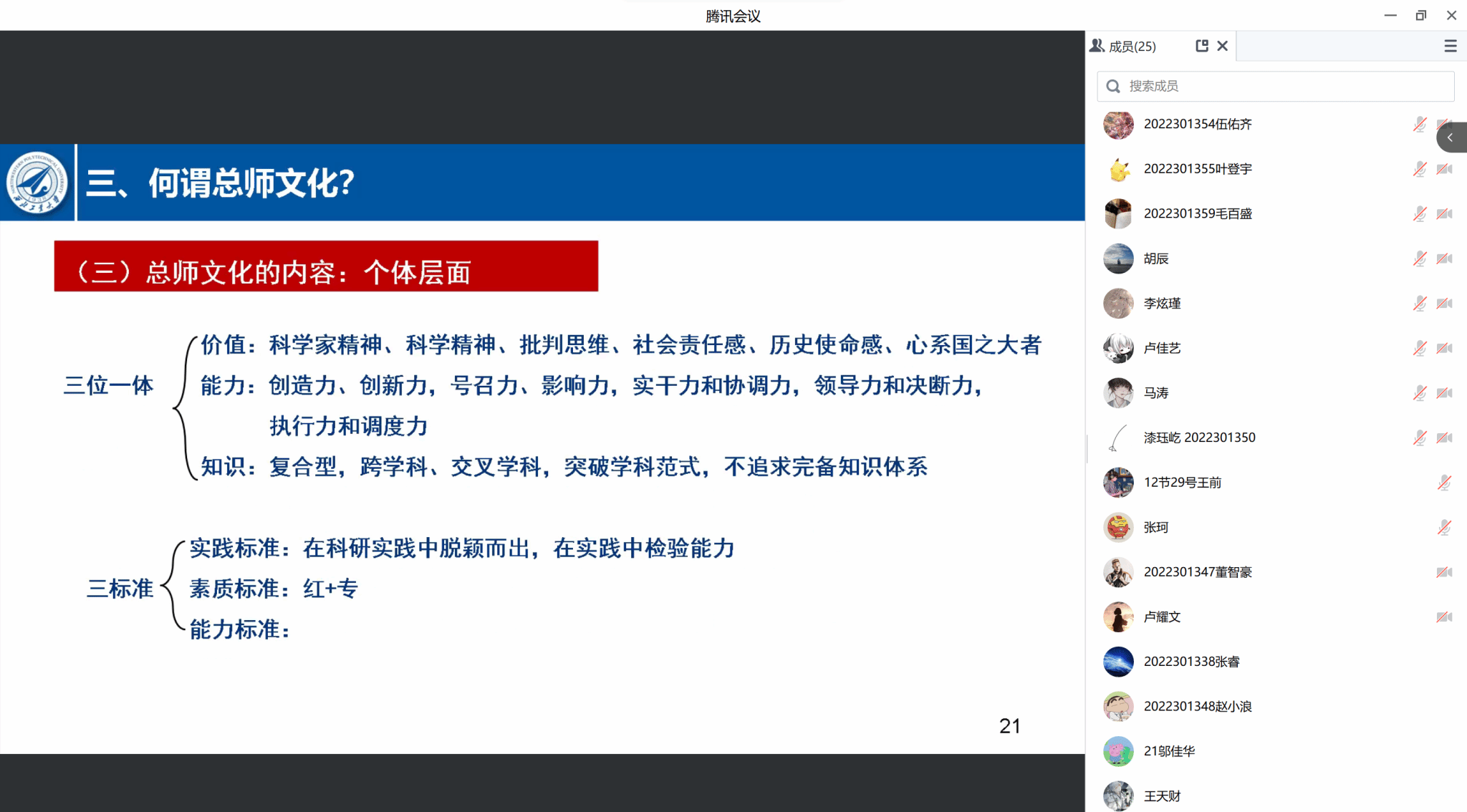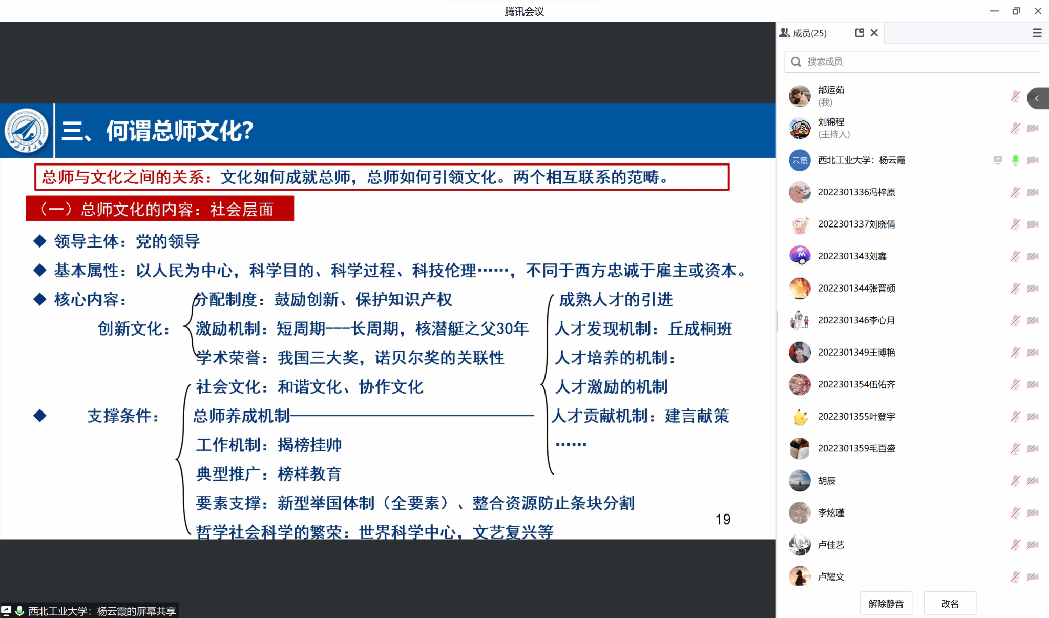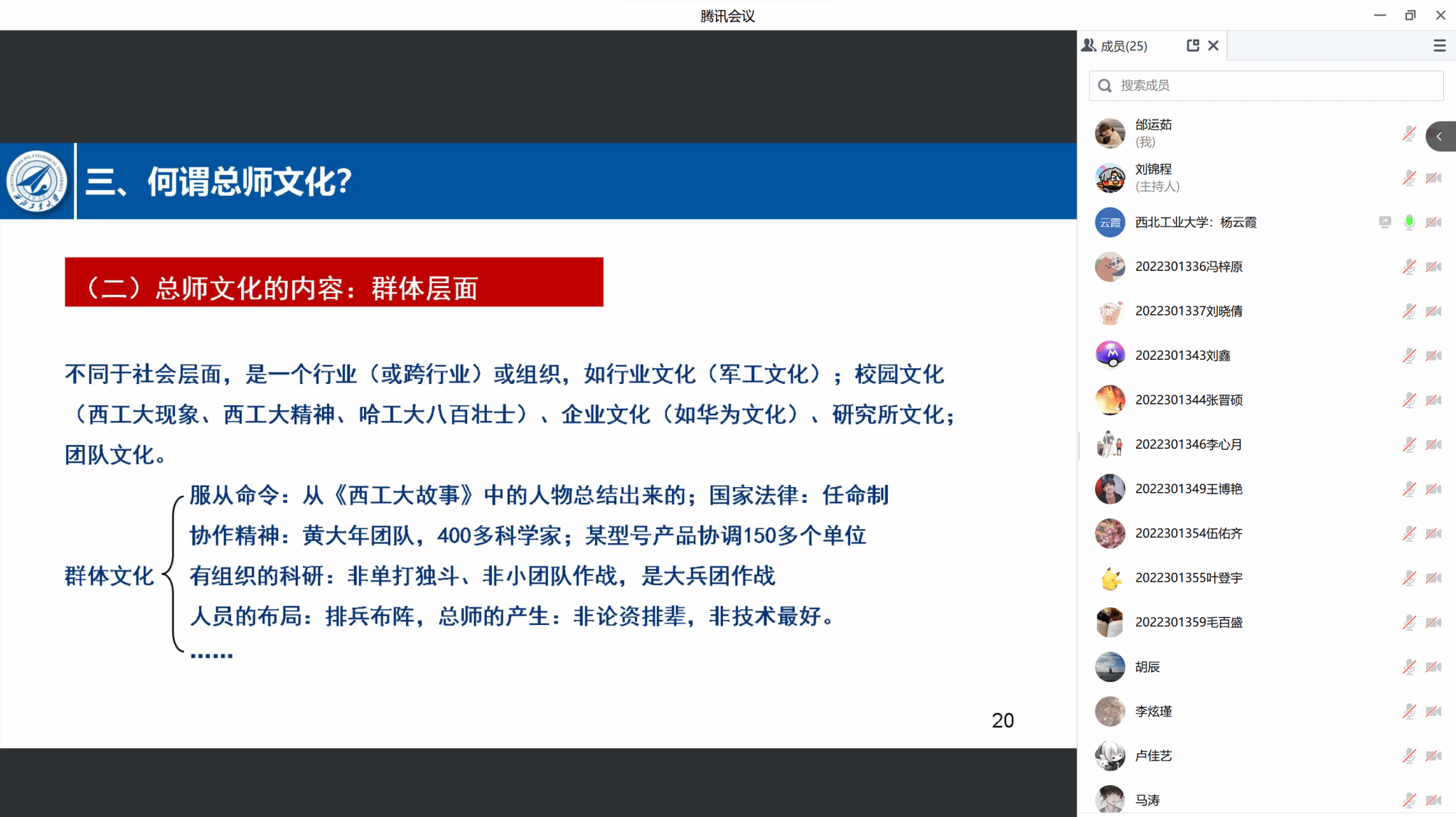 2023年6月11日上午8:30,太阳成tyc122cc经理杨云霞为其联系的DL032207班在线讲授了主题为“对总师文化及‘总师型’人才培养的一点思考”的思政课,班级25名同学全体参与并展开了研讨。