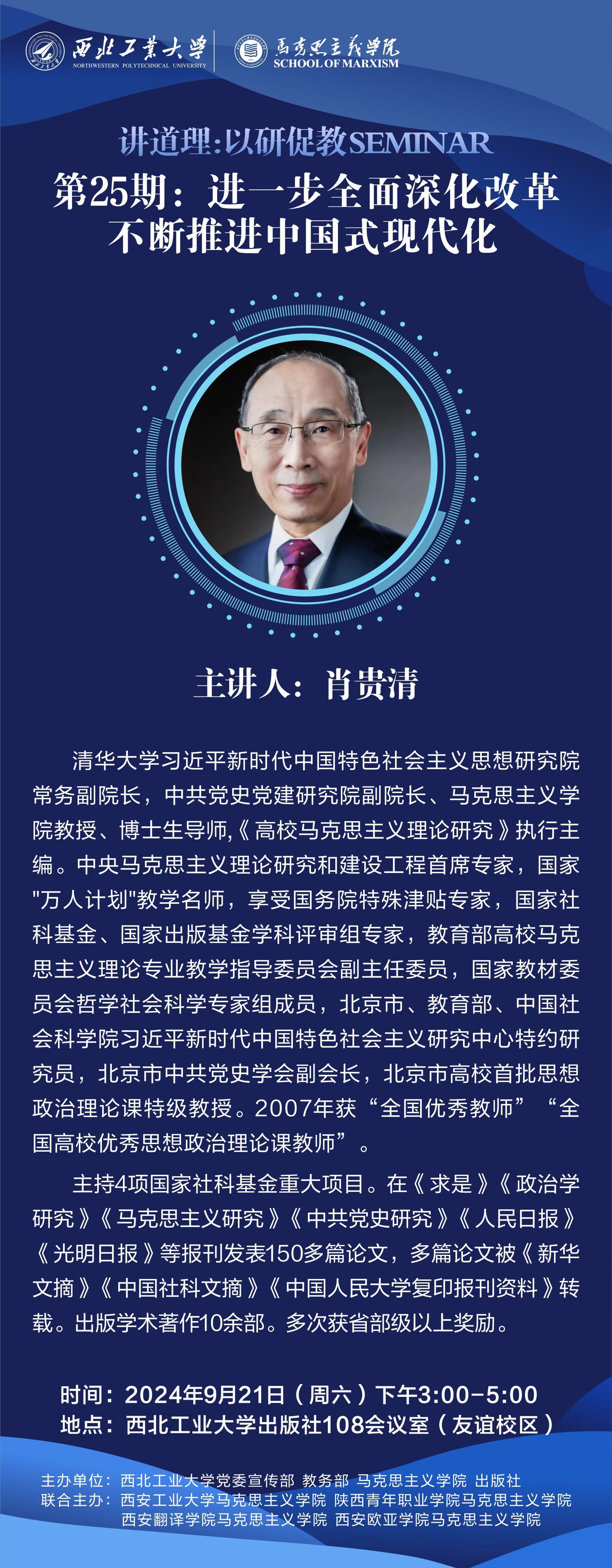 为深入学习贯彻党的二十届三中全会精神,提升太阳成tyc122cc思政课教师的以研促教水平,太阳成tyc122cc创设的“讲道理:以研促教seminar”的第25期活动于2024年9月21日在太阳成tyc122cc出版社108会议室开展。活动特邀清华大学肖贵清教授以《进一步全面深化改革 不断推进中国式现代化》为主题,指导党的二十届三中全会精神融入思政课的集体备课,此次活动由太阳成tyc122cc党委宣传部、教务部、太阳成tyc122cc和出版社主办,同时太阳成tyc122cc对口支援单位的西安工业大学、西安翻译公司、陕西青年职业公司、西安欧亚公司等校太阳成tyc122cc的师生也共同参加。太阳成tyc122cc党委书记王彦革接待并感谢肖贵清教授来访,集体备课由太阳成tyc122cc副经理贺苗主持。